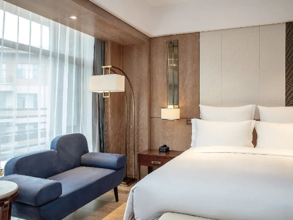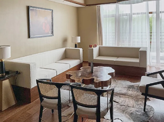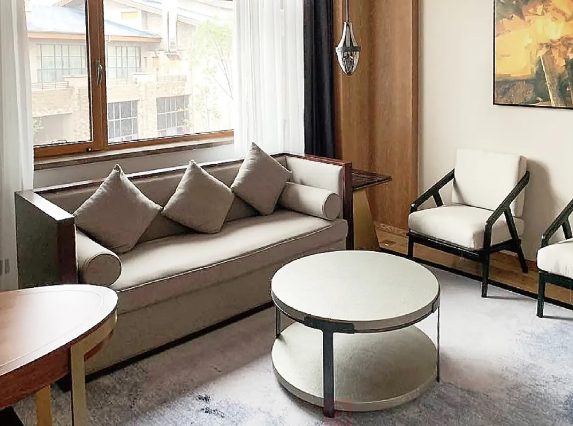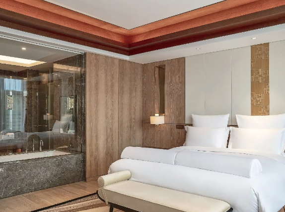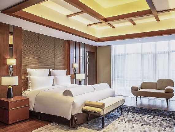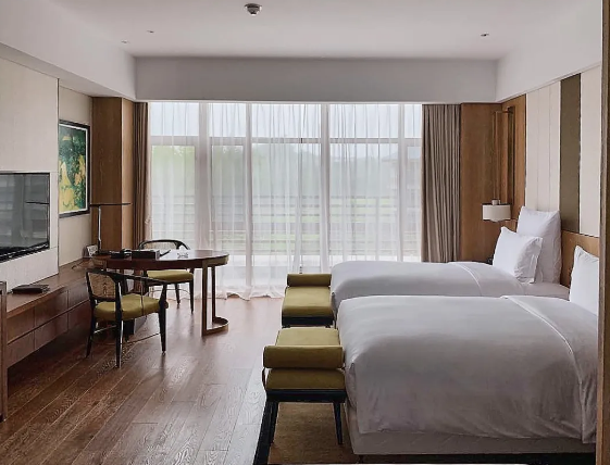 客房家具的陳設(shè)精致考究,溫和的調(diào)色、家具的擺放與布局更是講究了對(duì)稱與韻律感。