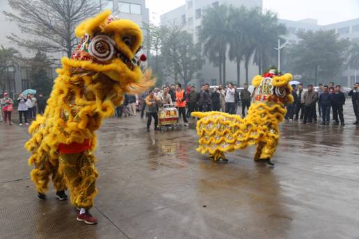 早上9:00,細(xì)雨霏霏。雅柏公司生產(chǎn)基地內(nèi)充滿歡聲笑語,鞭炮齊鳴,鑼鼓喧天,在寬敞的公司院內(nèi)一對(duì)醒獅憨態(tài)可愛,形神兼?zhèn)?。時(shí)而威風(fēng)凜凜,閃展騰挪;時(shí)而謙恭有禮,憨厚善良,逗人喜愛。起勢(shì)、常態(tài)、奮起、疑進(jìn)、抓癢、迎賓、施禮、驚躍、審視、酣睡、出洞、上臺(tái)取物等等,無不神似。巍巍醒獅帶給雅柏人新春的喜悅和新年的祝福!